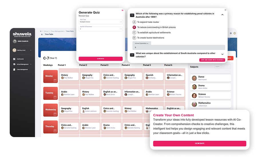 A centralized dashboard that empowers administrators to efficiently track student progress, lesson coverage, identify learning gaps, and generate customizable reports.
